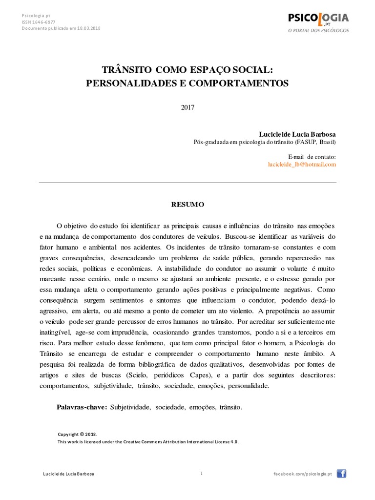 comportamento; trânsito; sociedade; emoções; personalidade; espaço social.