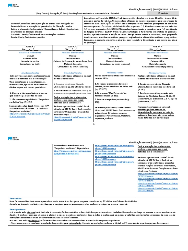 (Para)Textos | Português, 9º Ano | Planificação de atividades – semana de 14 a 17 de abril 3º período