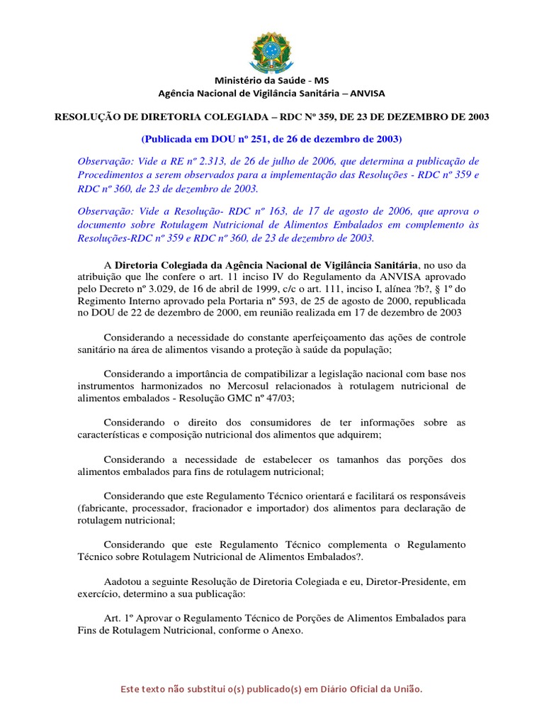 RESOLUÇÃO DE DIRETORIA COLEGIADA – RDC Nº 359, DE 23 DE DEZEMBRO DE 2003
