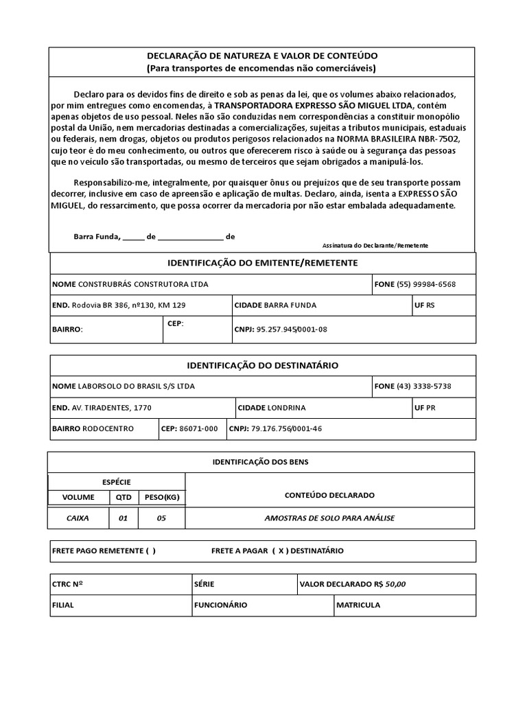 CTRC Nº SÉRIE VALOR DECLARADO R$ 50,00