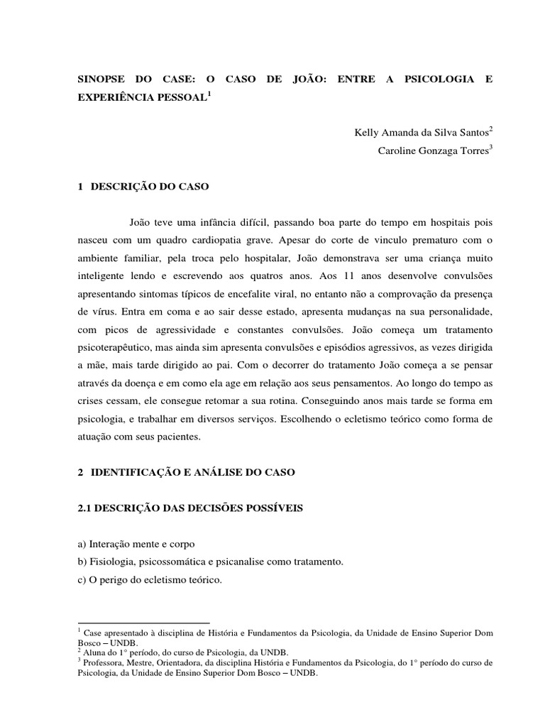 Case apresentado à disciplina de História e Fundamentos da Psicologia, da Unidade de Ensino Superior Dom