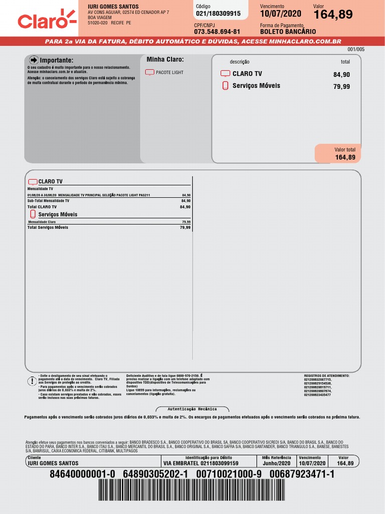 IURI GOMES SANTOS VIA EMBRATEL 0211803099159 Junho/2020 10/07/2020 164,89