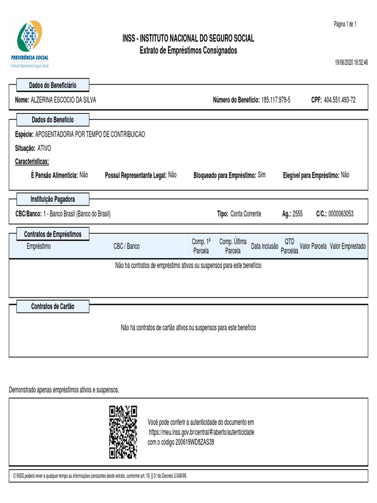 Nome: ALZERINA ESCOCIO DA SILVA Número do Benefício: 185.117.979-5 CPF: 404.551.493-72