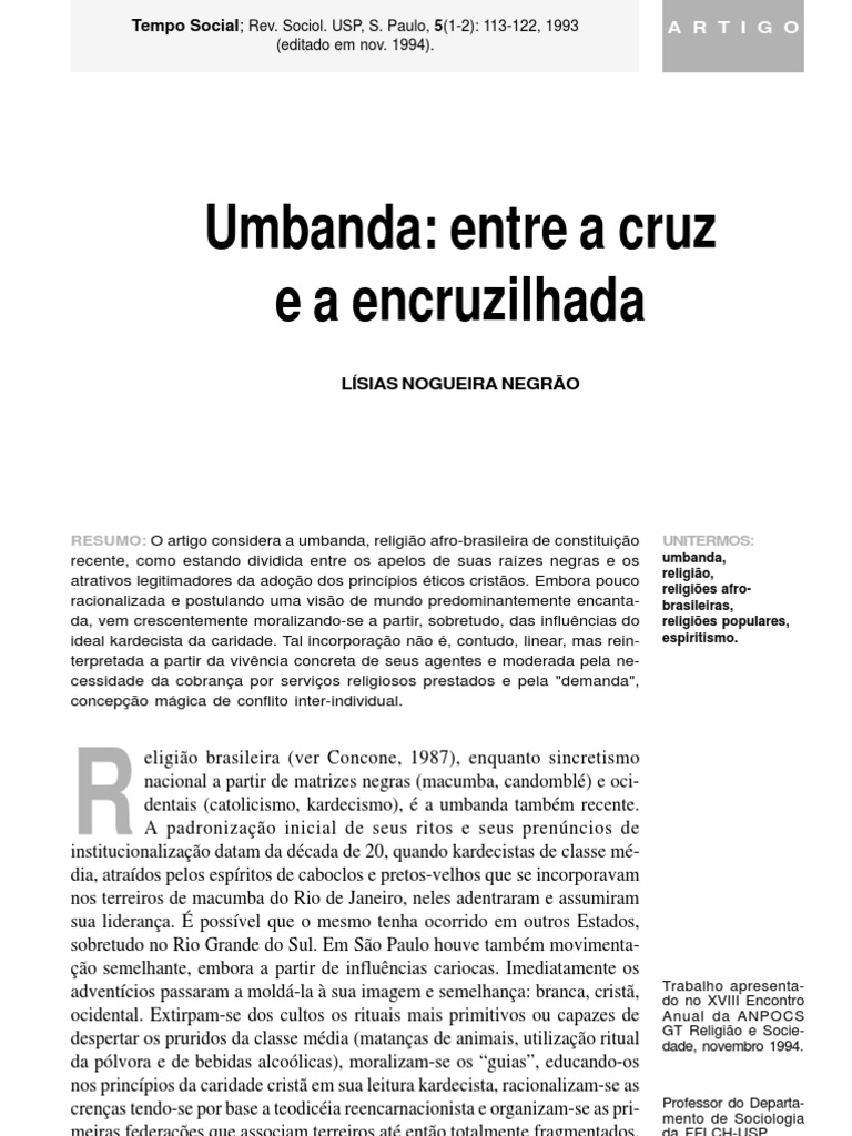 ). Tempo Social. Umbanda e política. REFERÊNCIAS BIBLIOGRÁFICAS AUBRÉE. P. Fondo de Cultura Económica. la religion et le droit. ISER/Ed. BASTIDE. Sociol. Abril. C. Religião e Sociedade Brasileira. Renato. (1974) Magia. B. Ed. le livre et les esprits. USP. Paulo. (1983) Catecismo positivista. it has been becoming increasingly popular religions. CER-FFLCH da USP. Paris. Such an spiritism. Ed. Lísias Nogueira. above all. Ed. François. PUF. (1973) Umbanda e questão moral: formação e atu- alidade do campo umbandista em São Paulo. Zahar Ed. ORTIZ. Auguste. CERU-FFLCH da USP. ______ . (1975) Guerra de Orixá: um estudo de ritual e confli- to. São Paulo. Pioneira-EDUSP. La vocation actuelle de la sociologie. Os Pensadores. umbanda. VELHO. 2a ed. In: CERU (org. São Paulo. Revisitando a terra de contrastes: a atualidade da obra de Roger Bastide. Estudos 18. ______ . vol. S. Lísias Nogueira. (1956) La magie. Paris. (1990) La table. 122 . as from influences of the Kardecist ideal of charity. 1994). but reinterpreted as from the concrete experience of its agents and moderated by the need of requesting religious services rendered and by the “demand”. Vol. Clattès. Rev. Pioneira-EDUSP. Petrópolis. São Paulo. UNITERMS: ABSTRACT: The article considers Umbanda a recently formed afro-brazilian religion. FFLCH-USP. Brasiliense. J. 2. Ed. NEGRÃO. Rio de Janeiro. 1993 (editado em nov. In: ______ . religión. Reli- gião e Sociedade. In: Estudos afro-brasileiros. Max. 13/1. GURVITCH. Tese de livre-docência. COMTE. São Paulo. BROWN. (1964) Economía y sociedad. In spite of barely rationalized and alleging a afro-brazilian religions. Livraria Ed. Mexico/Buenos Aires. As religiões africanas no Brasil. II. (1986) Roger Bastide: do candomblé à umbanda. Maria Helena V. ciencia. CONCONE. Col. devided between the pleas of its black roots and the legitimizing attractions of religion. moralized. Ferreira de. São Paulo. (1985) Uma história da umbanda no Rio. Editorial Ariel. Perspectiva. Rio de Janeiro. adopting Christian ethical principles. however. Umbanda: entre a cruz e a encruzilhada. Georges. Marion & LAPLANTINE.). Col. MONTEIRO. (1991) A morte branca do feiticeiro negro. CAMARGO. Vozes. magic concept of inter-individual conflict. Yvonne Alves. In: _______ . Marco Zero. NEGRÃO. Diana. WEBER. integration is not. MALINOWSKI. (1961) Kardecismo e umbanda. (1971) Nascimento de uma religião. Duglas Teixeira. Ed. predominantly enchanted view of the world. São Paulo. Roger. São Paulo. (1987) Umbanda: uma religião brasileira. Bronislaw. Barcelona. 5(1-2): 113-122. (1973) A macumba paulista. São Paulo. Umbanda e socie- dade brasileira. In: ISER (org. (1978) Roger Bastide: religião e ideologia. Col. linear. Ed.