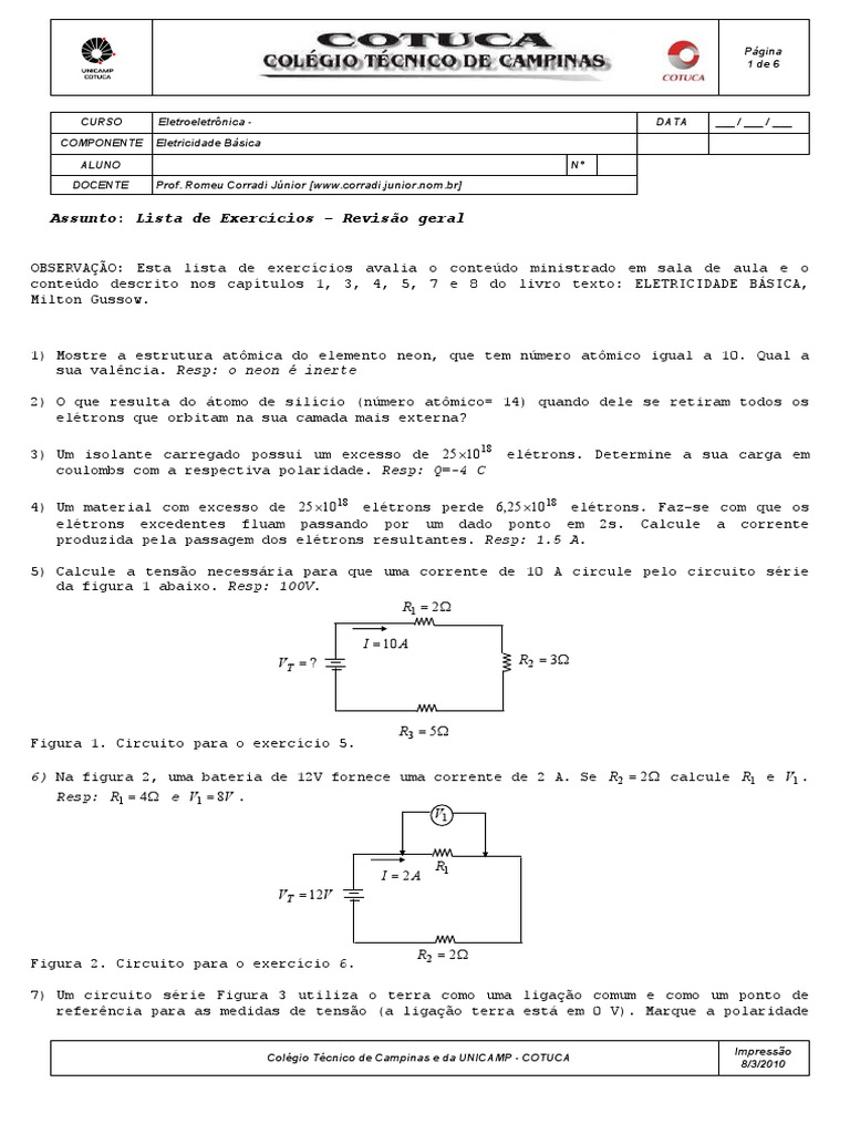 conteúdo descrito nos capítulos 1, 3, 4, 5, 7 e 8 do livro texto: ELETRICIDADE BÁSICA,