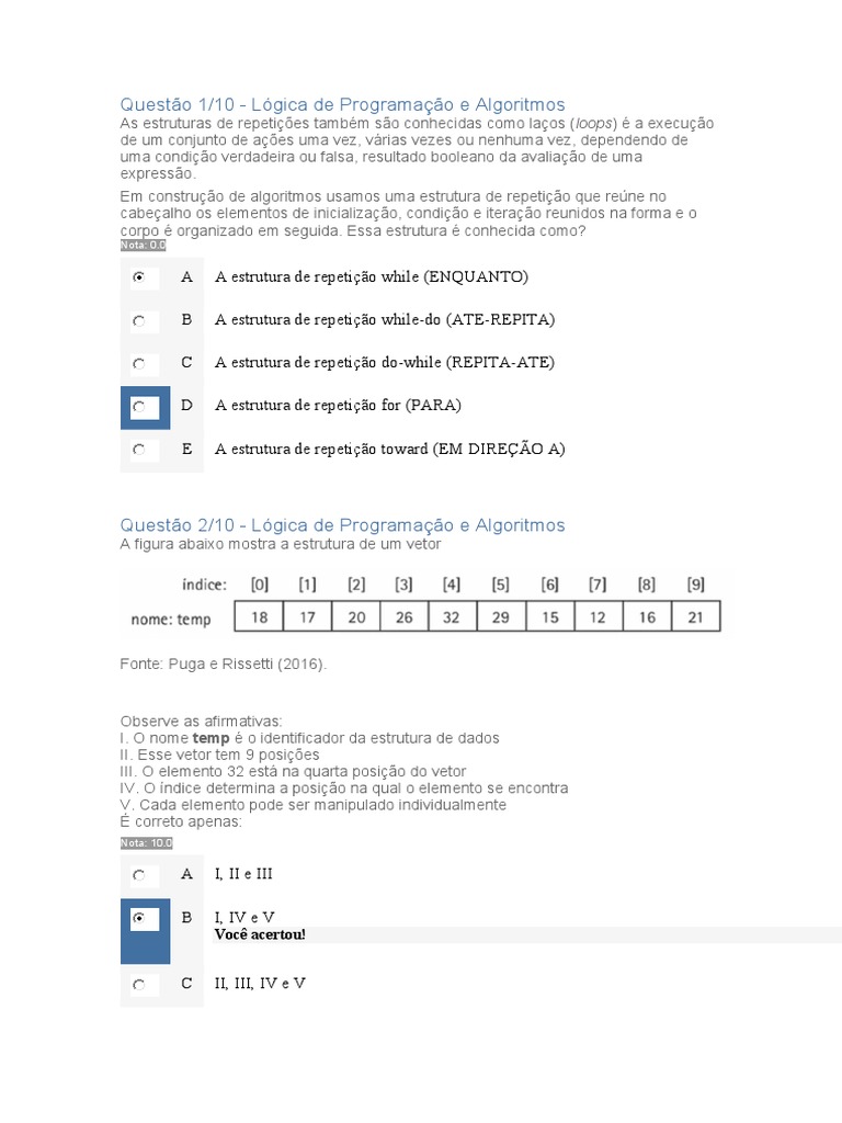 Questão 1/10 - Lógica de Programação e Algoritmos