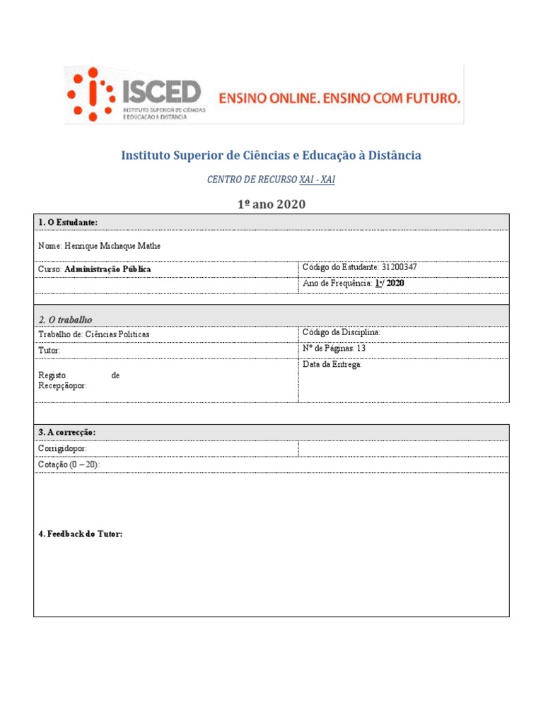 Trabalho de: Ciências Politicas Código da Disciplina: