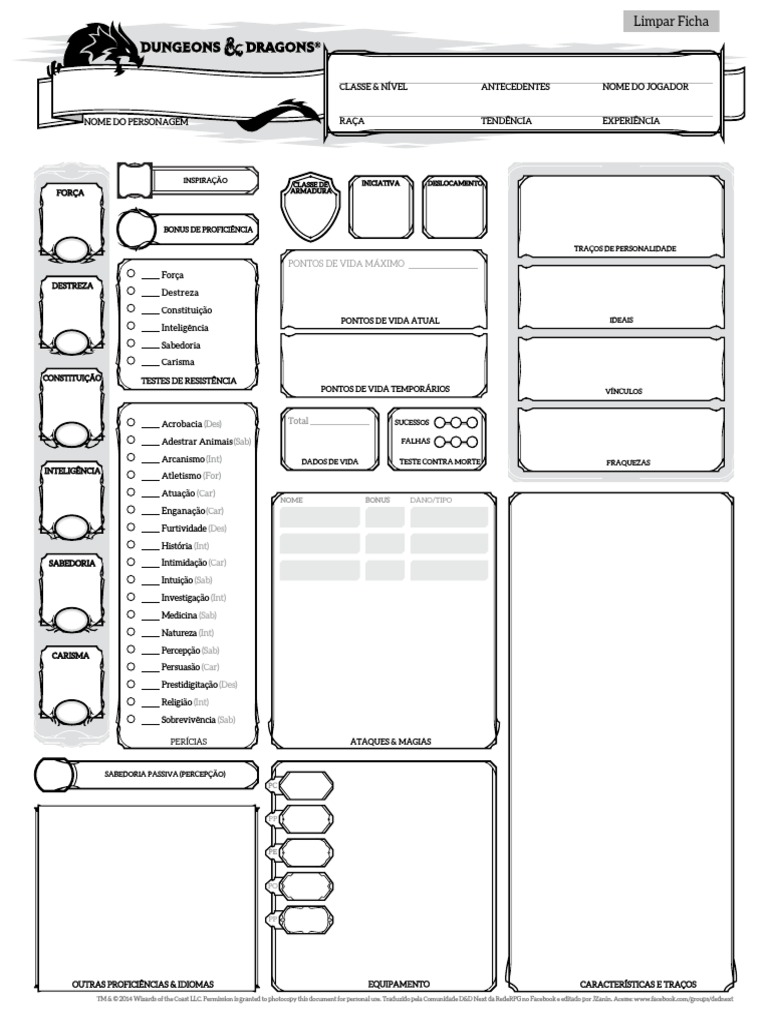 TM & © 2014 Wizards of the Coast LLC. Permission is granted to photocopy this document for personal use. Traduzido pela Comunidade D&D Next da RedeRPG no Facebook e editado por JZanin. Acesse: www.facebook.com/groups/dednext