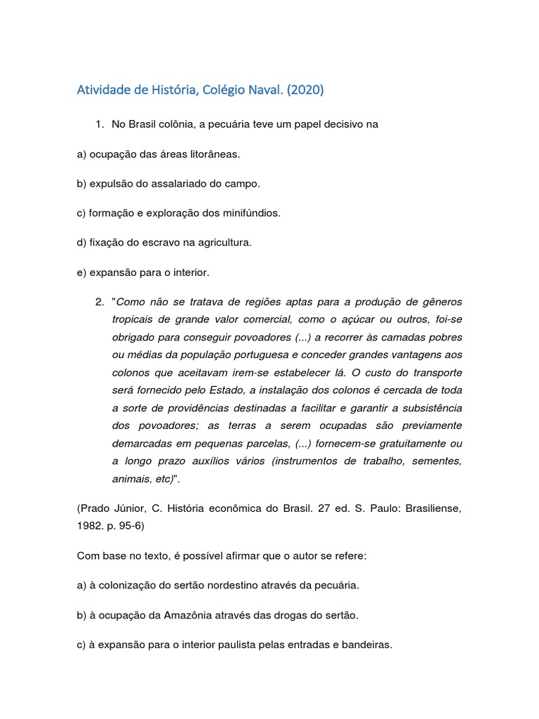 1. No Brasil colônia, a pecuária teve um papel decisivo na