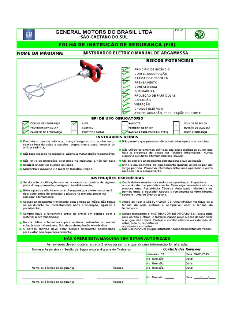 NOME DA MÁQUINA: MISTURADOR ELÉTRICO MANUAL DE ARGAMASSA