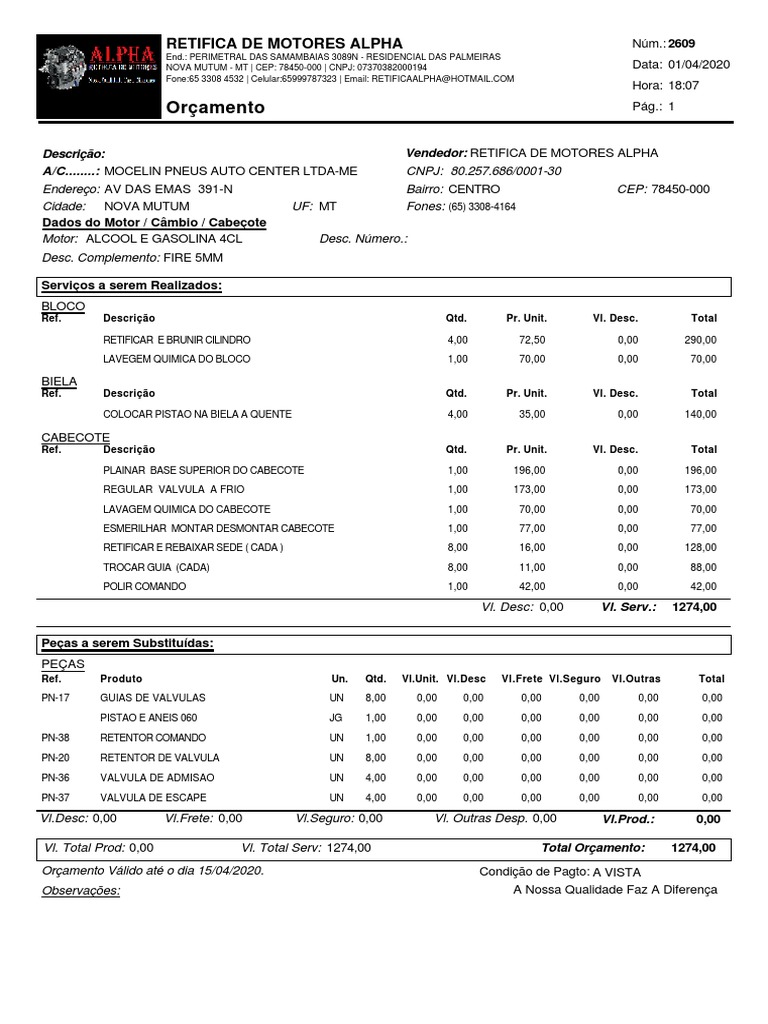 Vl. Total Prod: 0,00 Vl. Total Serv: 1274,00 Total Orçamento: 1274,00