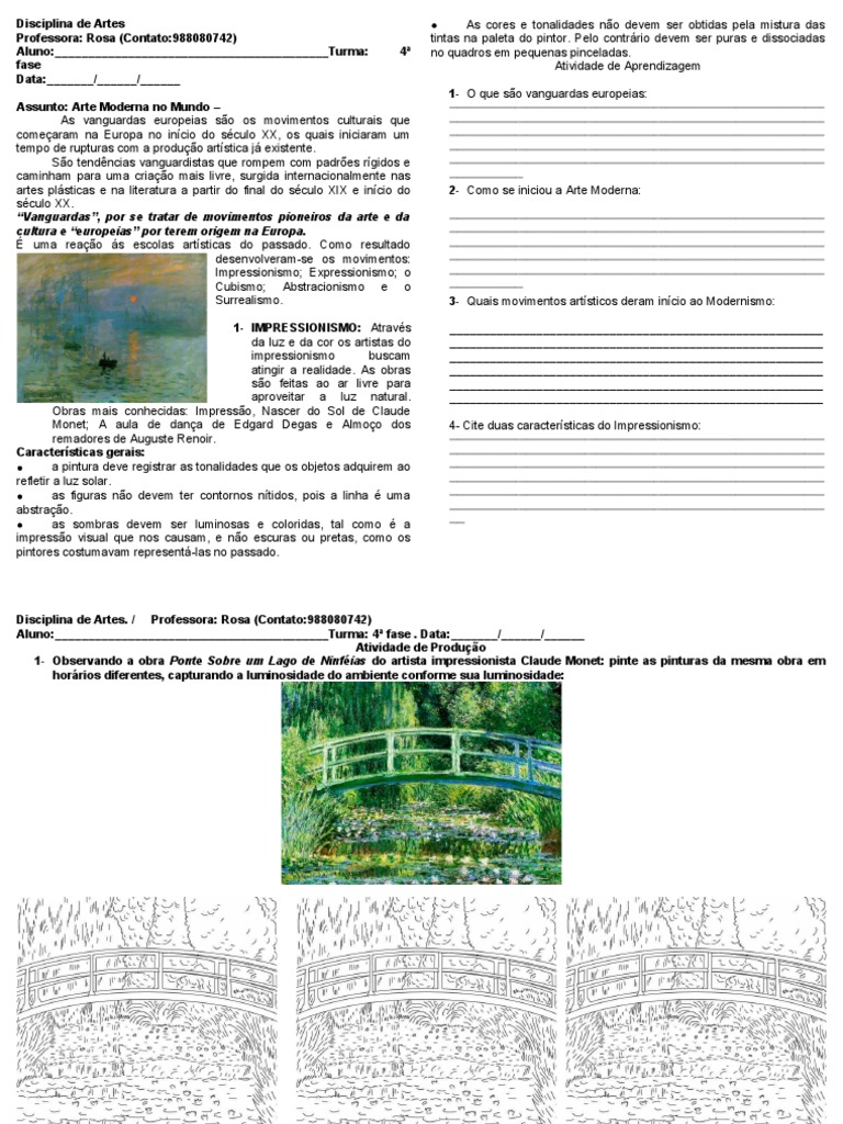 1- Observando a obra Ponte Sobre um Lago de Ninféias do artista impressionista Claude Monet: pinte as pinturas da mesma obra em