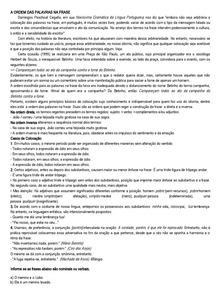 colocação das palavras na frase, em português, é muitas vezes livre, podendo variar de acordo com o tipo da mensagem falada ou