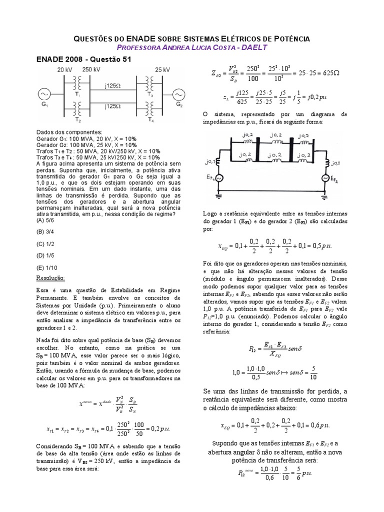 QUESTÕES DO ENADE SOBRE SISTEMAS ELÉTRICOS DE POTÊNCIA