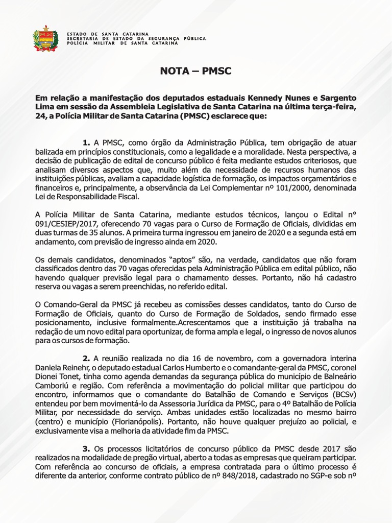 Por fim, a Polícia Militar de Santa Catarina lamenta a manifestação dos deputados