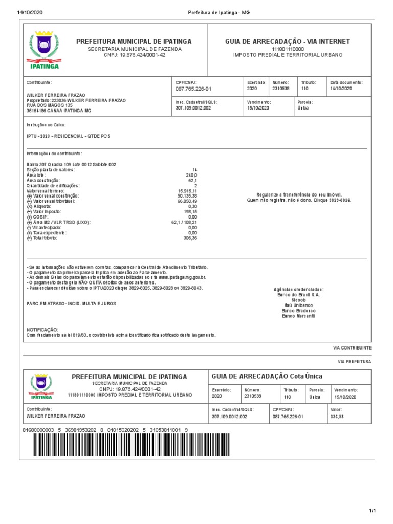 111801110000 IMPOSTO PREDIAL E TERRITORIAL URBANO 2020 2310538 110 Única 15/10/2020