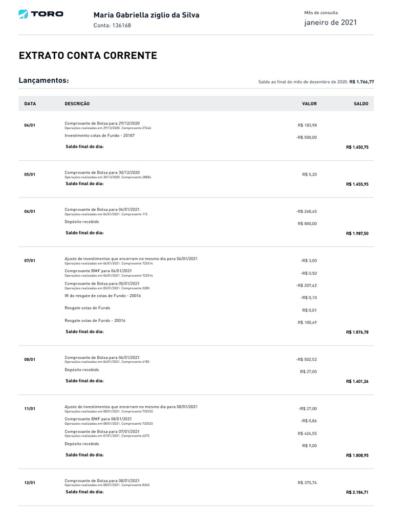 Operações realizadas em 06/01/2021. Comprovante 4185