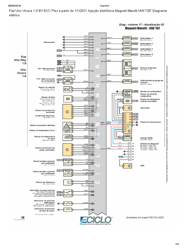 O diagrama elétrico do Fiat Uno Vivace 1.0 8V EVO Flex fabricado a partir de janeiro de 2011 descreve o sistema de injeção eletrônica Magneti Marelli IAW 7GF, incluindo informações sobre o motor, bateria, alternador, módulos de controle e sensores.