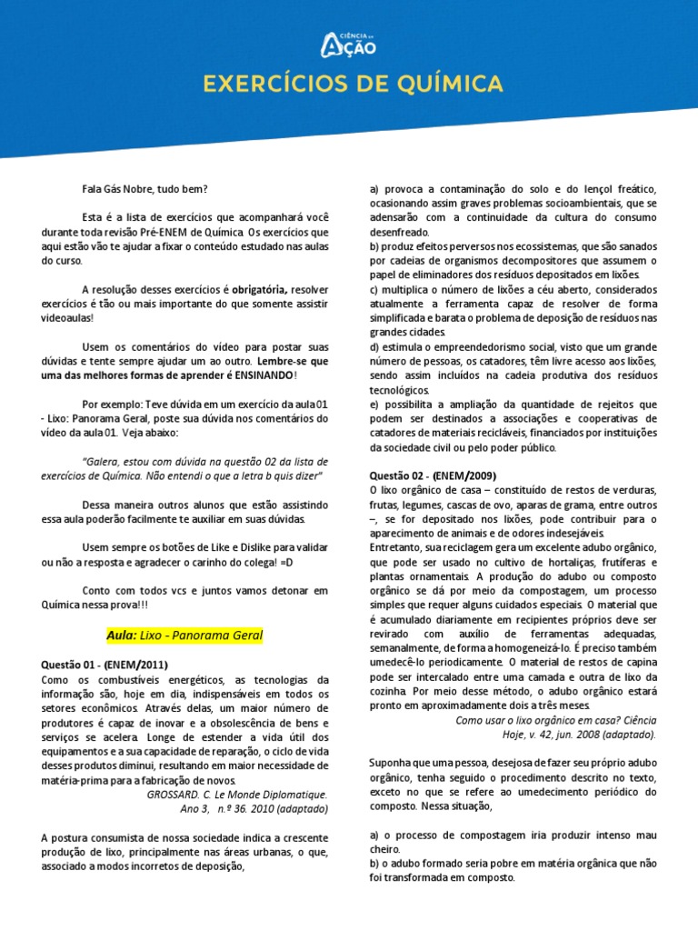 Revisão Pré-ENEM: Exercícios de Química