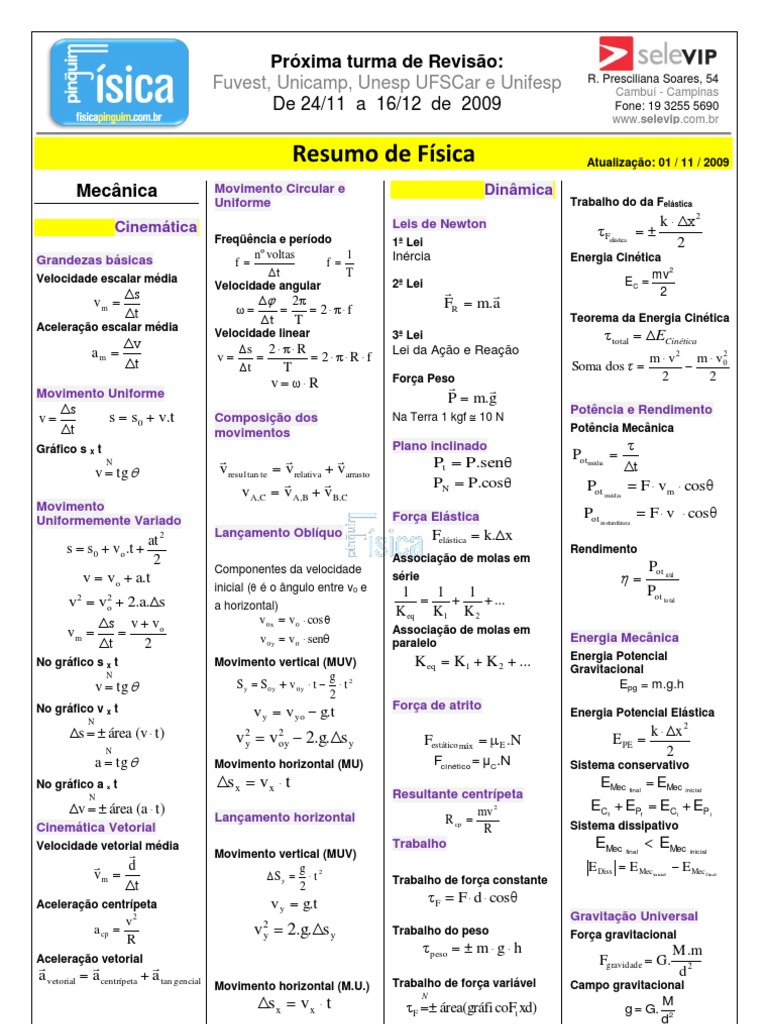 Resumo de fórmulas da física (ensino médio e vestibular) Versão 1.6 Prof. Pinguim pág 1