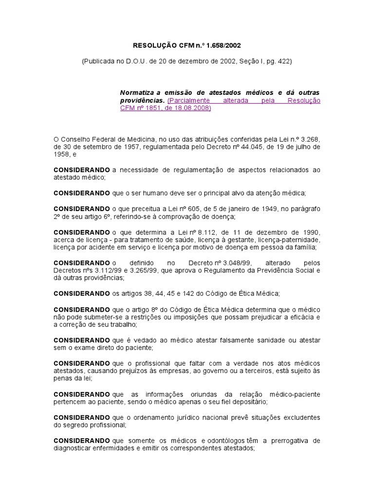 Art. 1º O atestado médico é parte integrante do ato médico, sendo seu