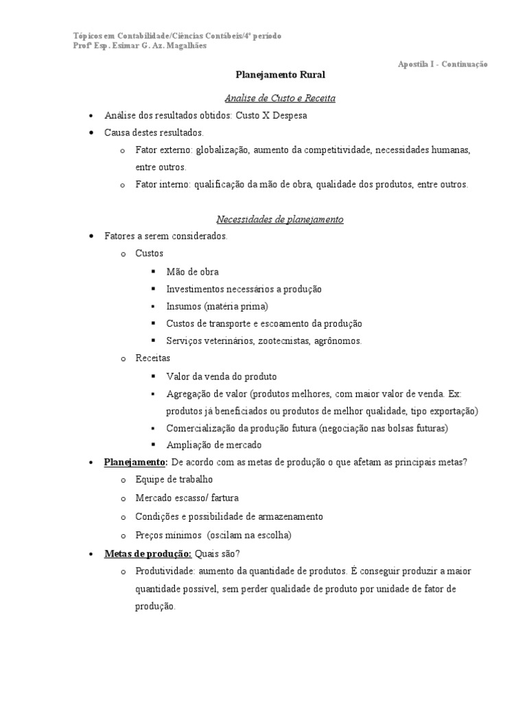 5) Quais são as metas de produção dentro Planejamento Rural? Explique.