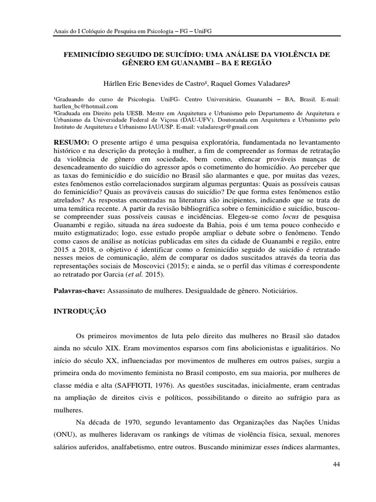 do feminicídio? Quais as prováveis causas do suicídio? De que forma estes fenômenos estão