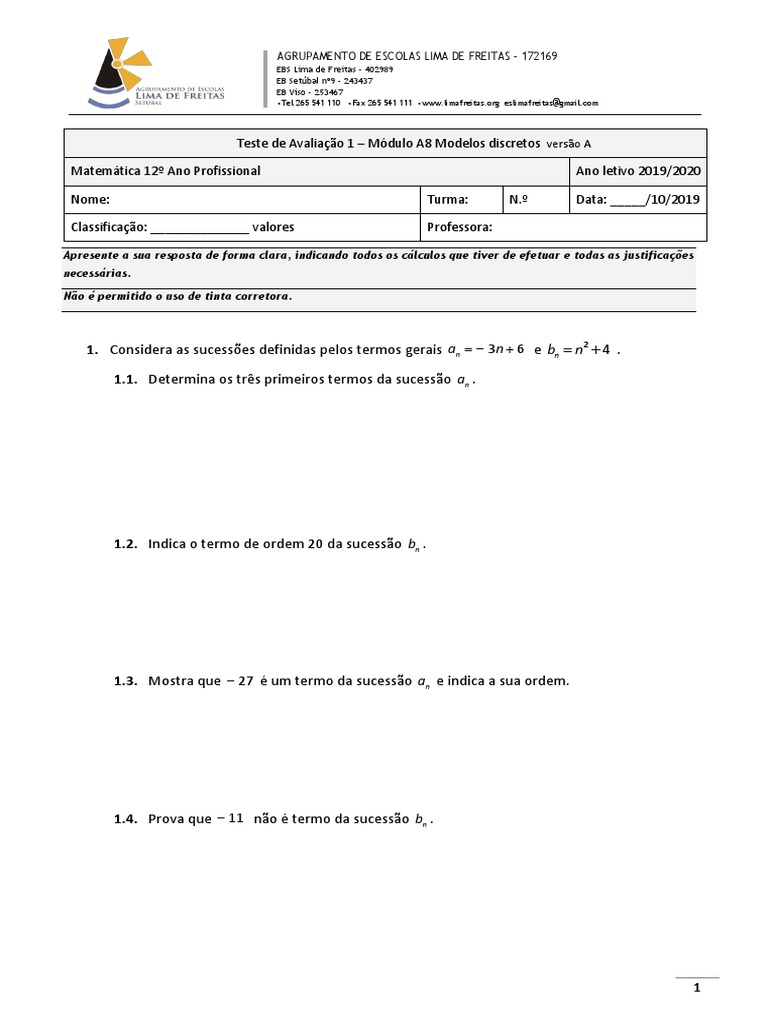 Teste de Avaliação 1 – Módulo A8 Modelos discretos versão A