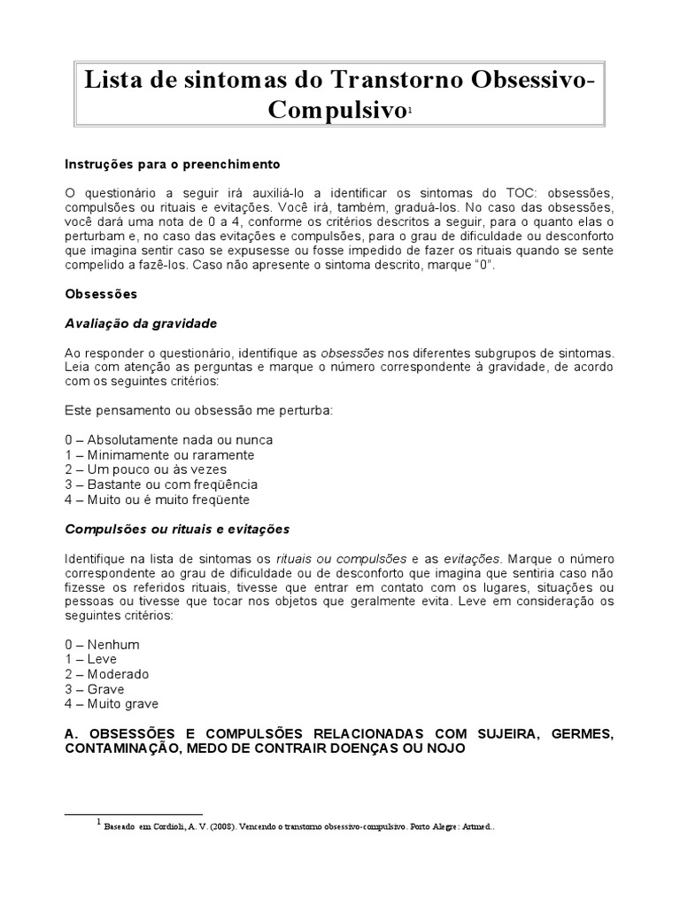 Baseado em Cordioli, A. V. (2008). Vencendo o transtorno obsessivo-compulsivo. Porto Alegre: Artmed..