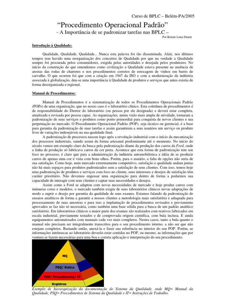 (POPs) de uma organização, que no nosso caso é o laboratório clínico. Esta coletânea de procedimentos é