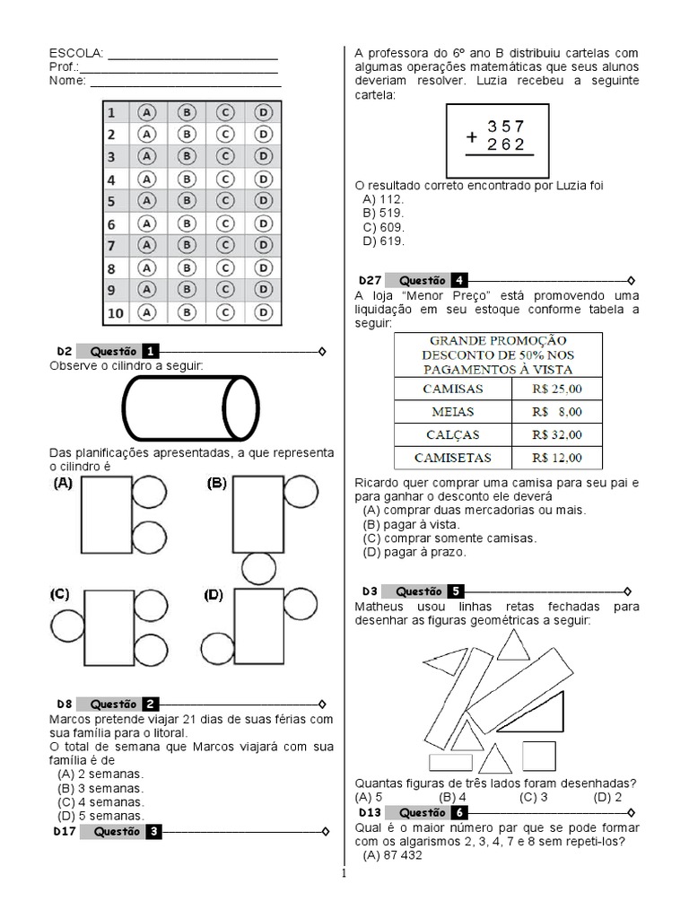 (D) 5 semanas. D13 Questão 6 –––––––––––––––––––––––––◊