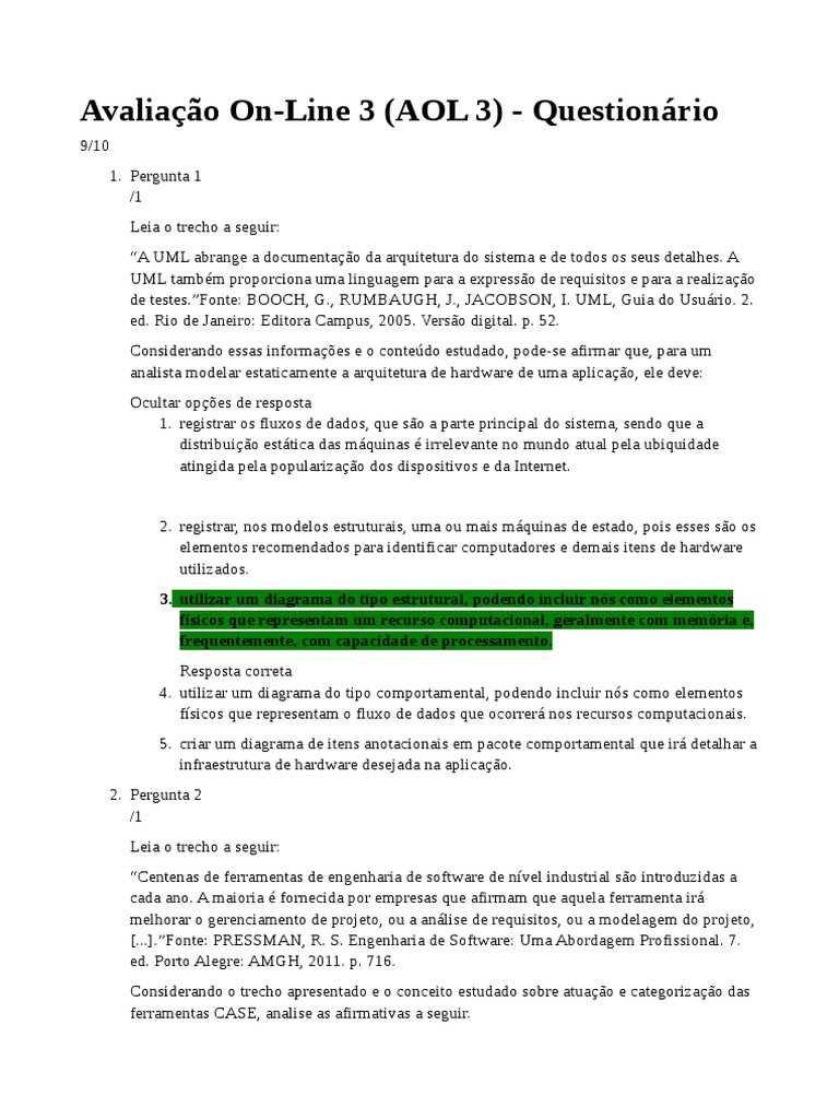 Avaliação On-Line 3 (AOL 3) - Questionário