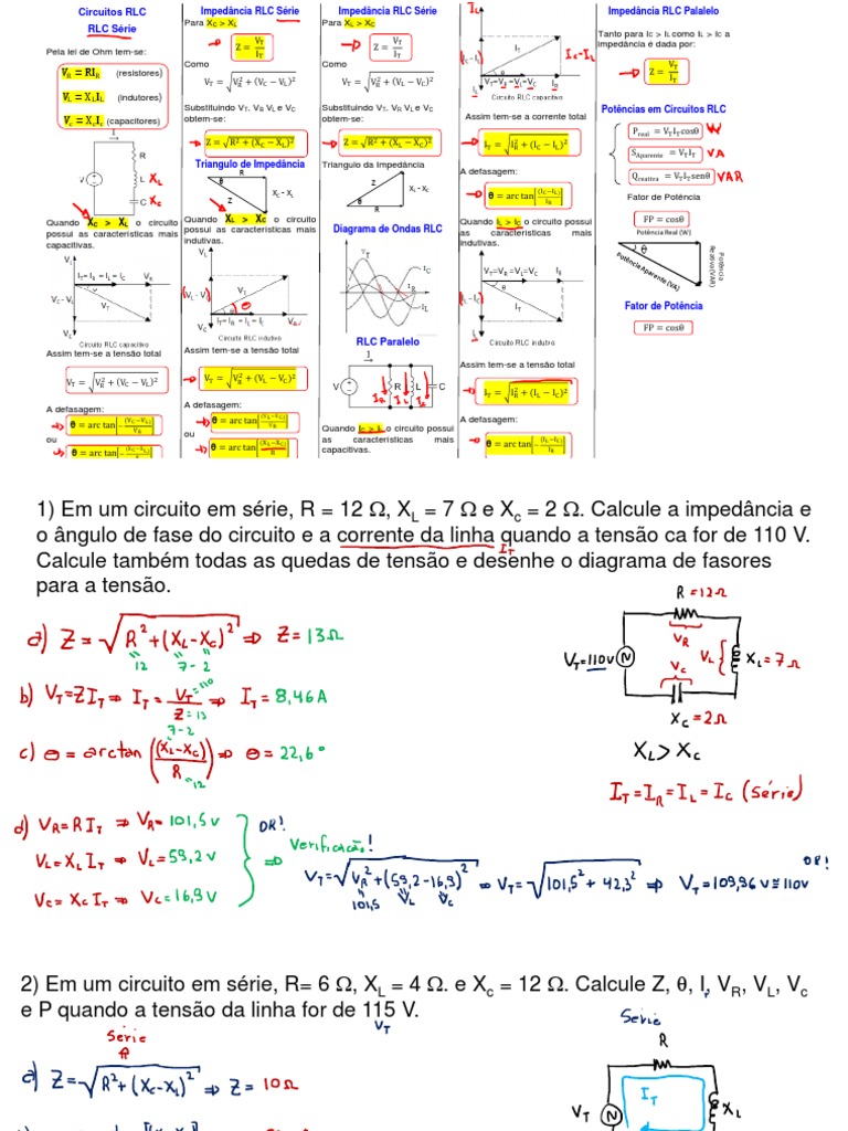 1) Em um circuito em série, R = 12 , XL = 7 e Xc = 2 . Calcule a impedância e