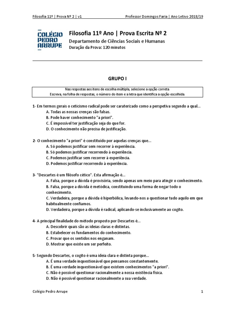 Filosofia 11º | Prova Nº 2 | v1 Professor Domingos Faria | Ano Letivo 2018/19