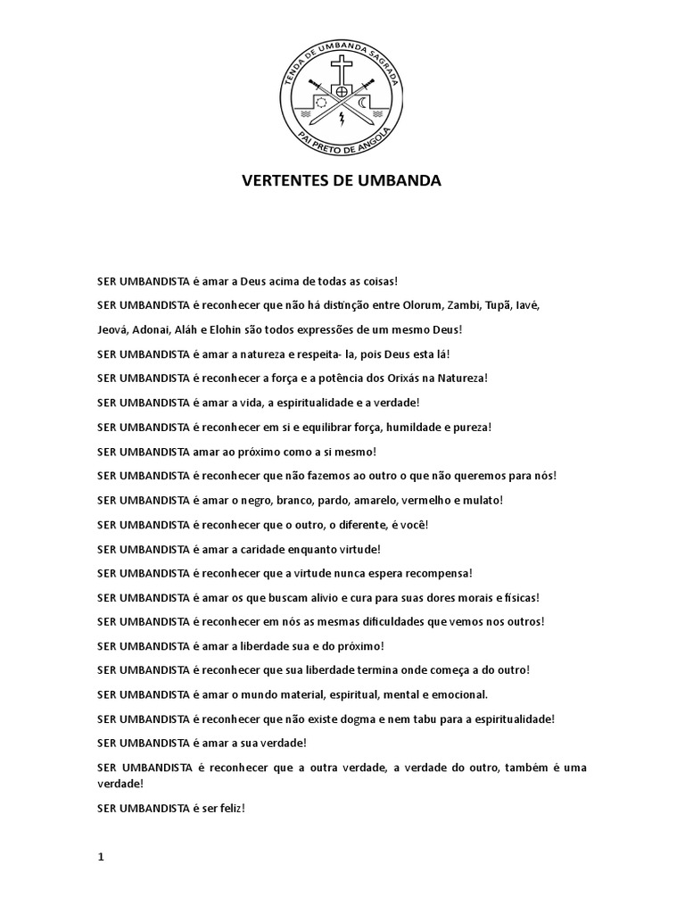 do meio, no qual a Umbanda é uma na essência e diversa nas formas de pra cá-la. O UM da