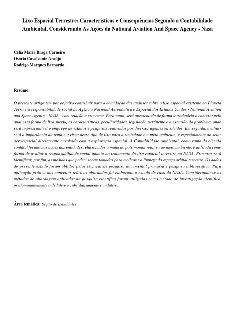 aeroespacial diretamente envolvido com a exploração espacial. A Contabilidade Ambiental, como ramo da ciência