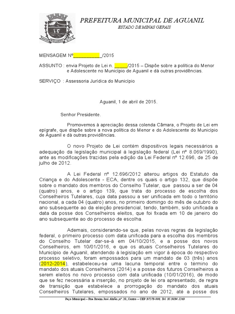 Prefeitura Municipal de Aguanil-MG, 1 de abril de 2015.