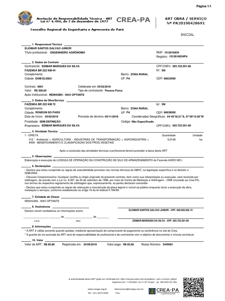 Valor da ART: R$ 85,96 Registrada em: 24/09/2019 Valor pago: R$ 85,96 Nosso Número: 5445081