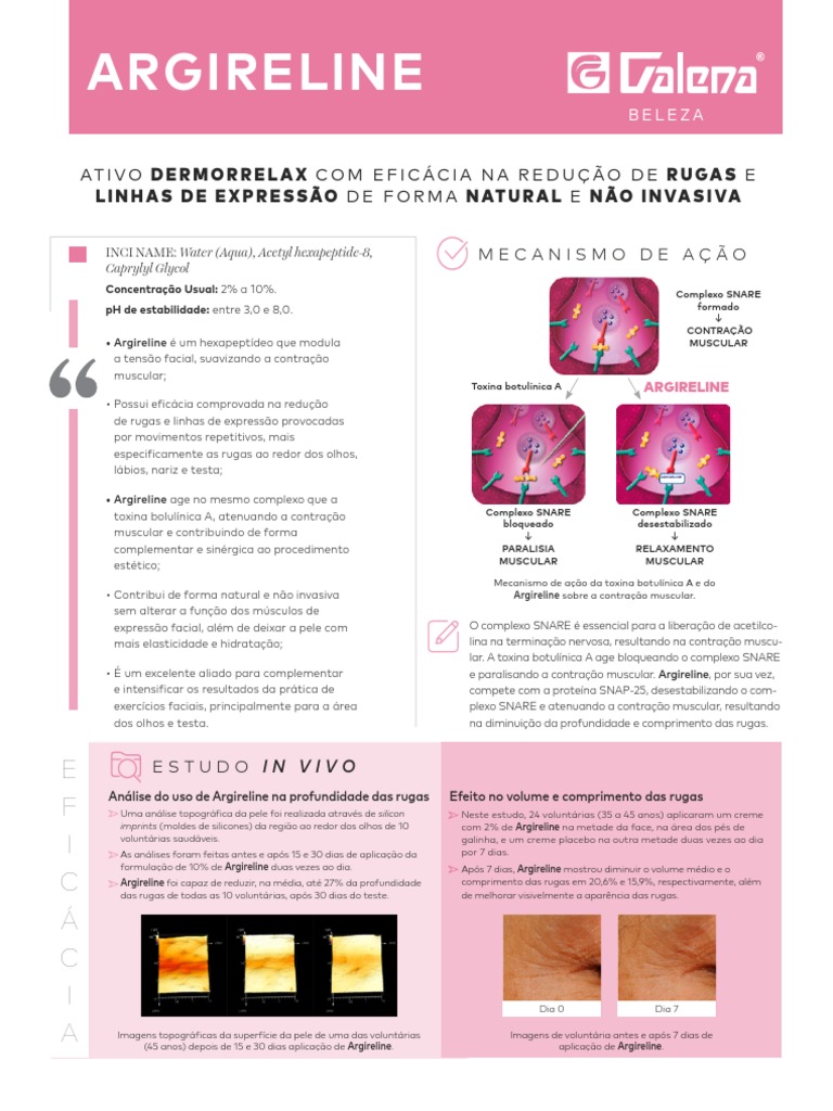 • É um excelente aliado para complementar e paralisando a contração muscular. Argireline, por sua vez,