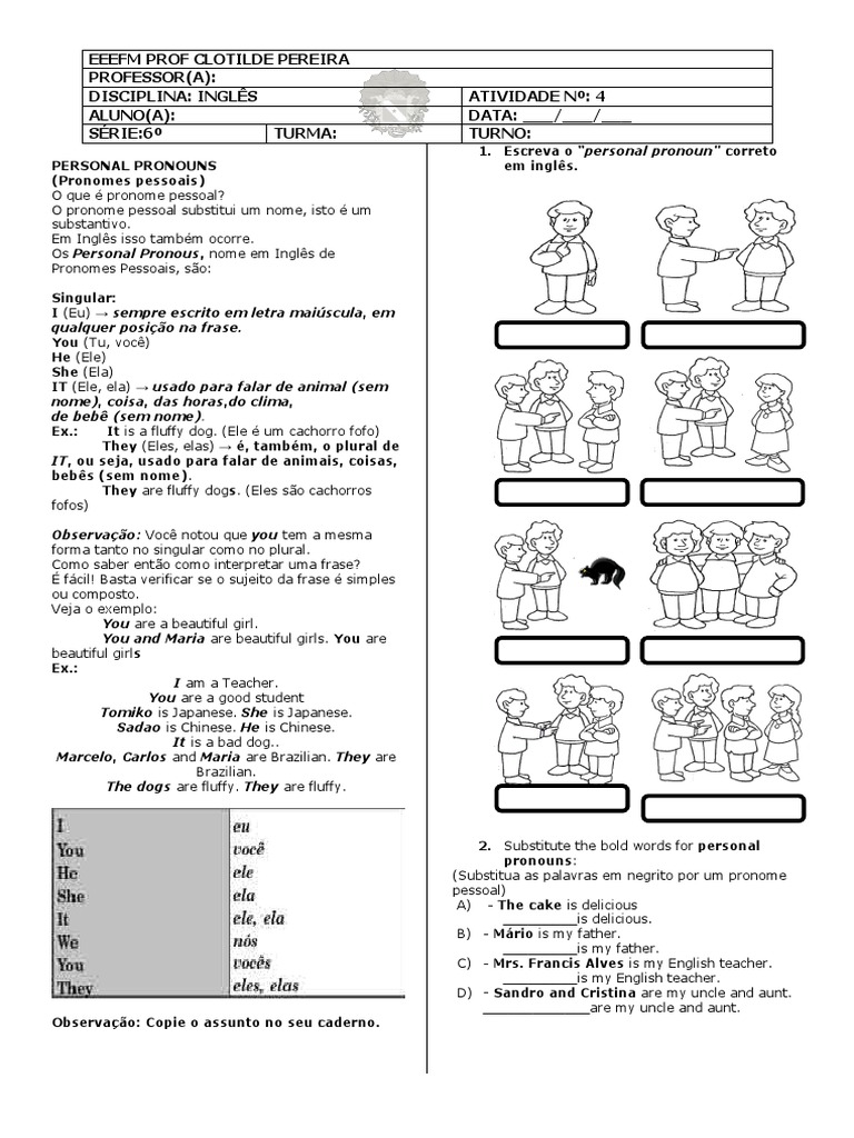 1. Escreva o “personal pronoun” correto