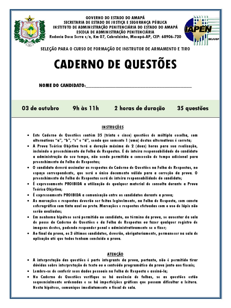 incluindo o preenchimento da Folha de Respostas. É de inteira responsabilidade do candidato