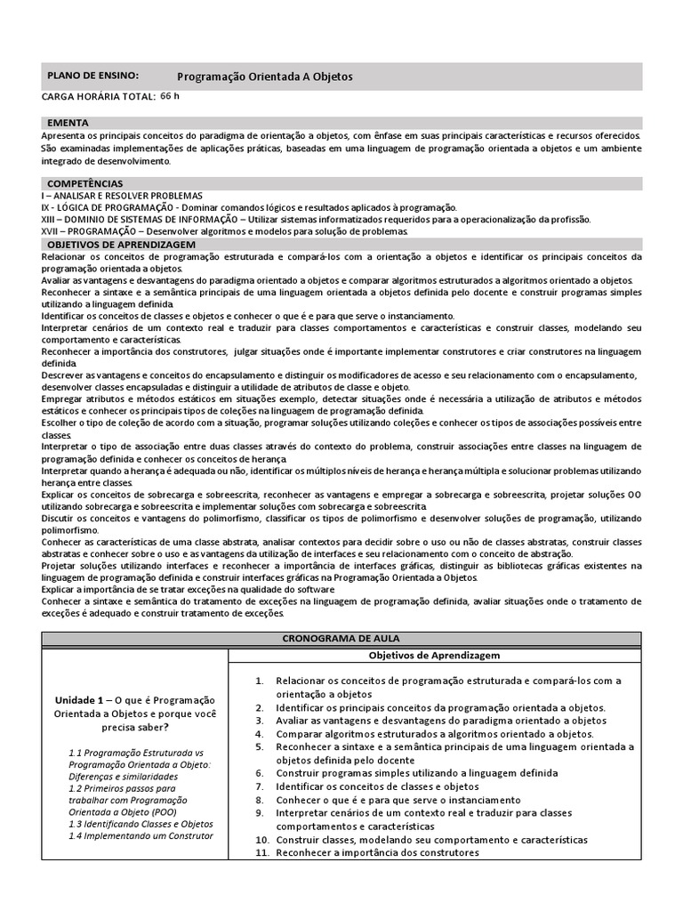 PLANO DE ENSINO: Programação Orientada A Objetos