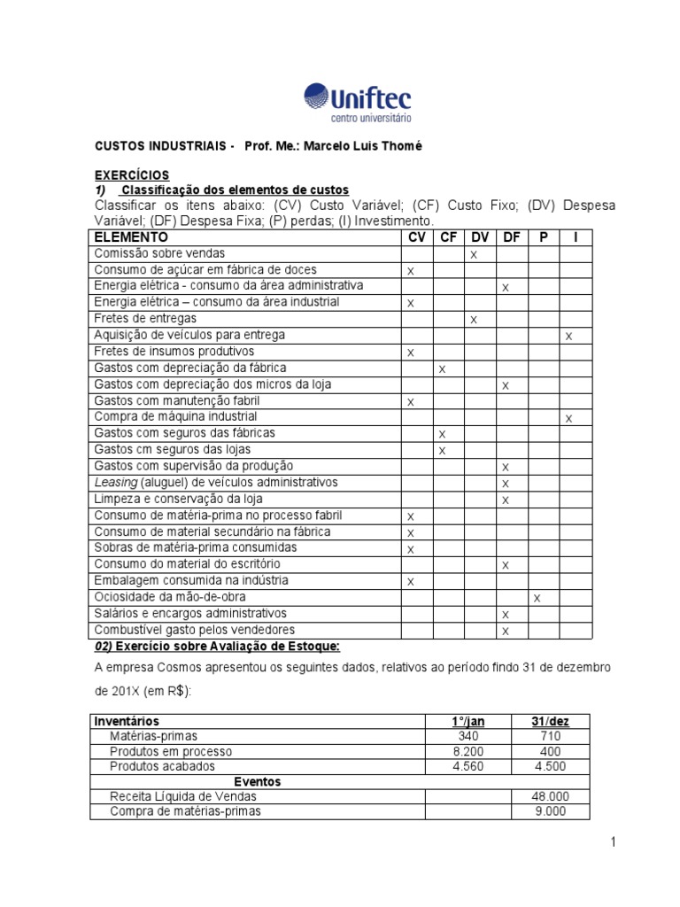 Classificar os itens abaixo: (CV) Custo Variável; (CF) Custo Fixo; (DV) Despesa