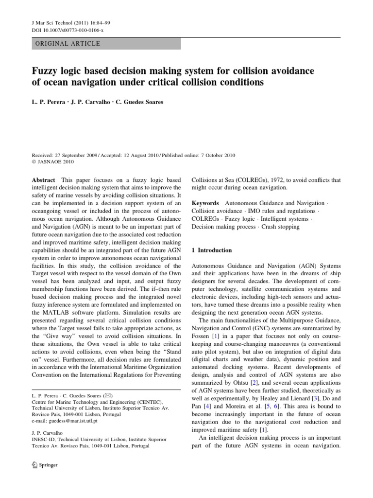 Fuzzy-logic based systems, which are formulated for human type thinking, facilitate a human friendly envi- ronment during the decision making process. Hence, several decision making systems in research and com- mercial applications have been presented before [29]. Automatic collision avoidance systems for ship systems using fuzzy logic based control systems have been pro- posed by Hasegawa [30]. The conjunction of human behaviour and the decision making process has been for- mulated by various fuzzy functions in Rommelfanger [31] and Ozen et al. [32]. A fuzzy logic approach for collision avoidance with the integration of a virtual force field has been proposed by Lee et al. [33]. However, the simulation results are limited to the two-vessel collision avoidance situations. Behaviour based controls formulated with interval pro- gramming for collision avoidance of ocean navigation are proposed by Benjamin et al. [34]. The collision avoidance behaviour is illustrated accordance with the Coast Guard Collision Regulations (COLREFGS-USA). Benjamin and Curcio [35] present the decision making process of ocean navigation based on an interval pro- gramming model for multi-objective decision making algorithms. The computational algorithm based on if–then logic is defined and tested under simulator conditions by Smeaton and Coenen [36] regarding different collision situations. Further, this study focused on a rule-based manoeuvring advice system for collision avoidance. Cockcroft and Lameijer presented detailed descriptions of collision avoidance rules, how the regulations should be interpreted and how to avoid collision [11]. Further, the complexity of autonomous navigation, not only in the sea but also in the ground, has been discussed by Benjamin and Curcio [34] who, in the same work, discuss the legal framework, rules and regulations, and the importance of collision avoidance within a set of given rules and regulations. This paper focuses on a fuzzy logic based DM system to be implemented in ocean navigation to improve safety of the vessel by avoiding collision situations under critical collision conditions; the system is a continuation of the study of Perera et al. [37]. The experienced helmsman’s actions in ocean navigation can be simulated by fuzzy logic based decision making process, and that could be one of the main advantages in this proposal. Even though similar approaches have been identified in the recent literature [30], some of the drawbacks of those studies are the ignorance of the COLREGs rules and regulations and of expert knowledge in ocean navigation (i.e. crash stopping manoeuvres) that have been extensively considered in this study. Further discussion on COLREGs rules and regula- tions and their importance in ocean navigation can be found in Sect. 2.