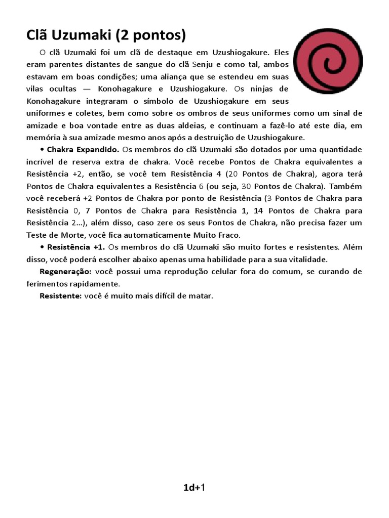 • Resistência +1. Os membros do clã Uzumaki são muito fortes e resistentes. Além