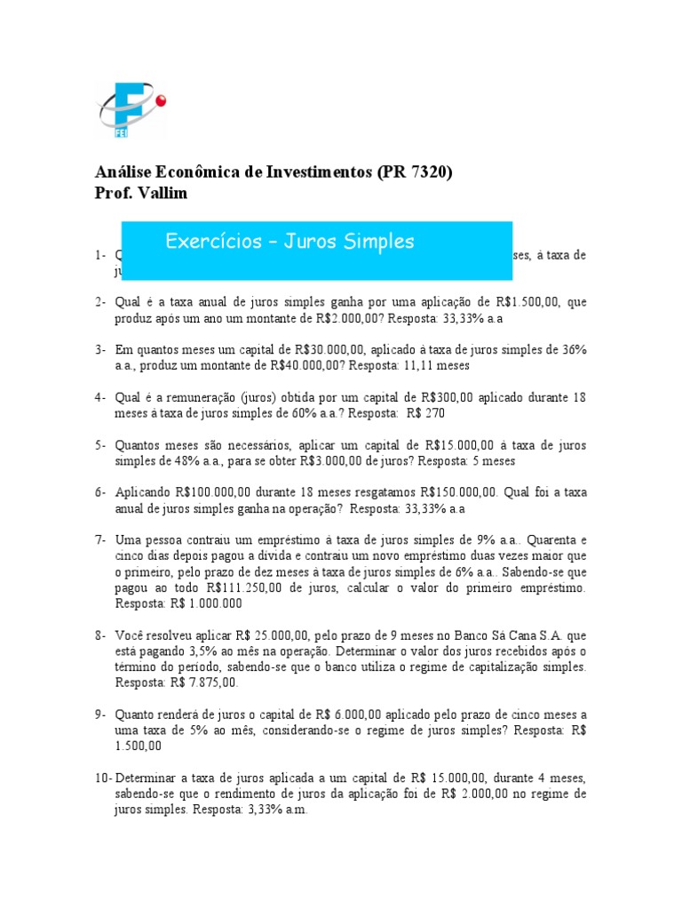obter uma taxa de juros simples de 20% ao ano para aplicações, determine, do ponto de