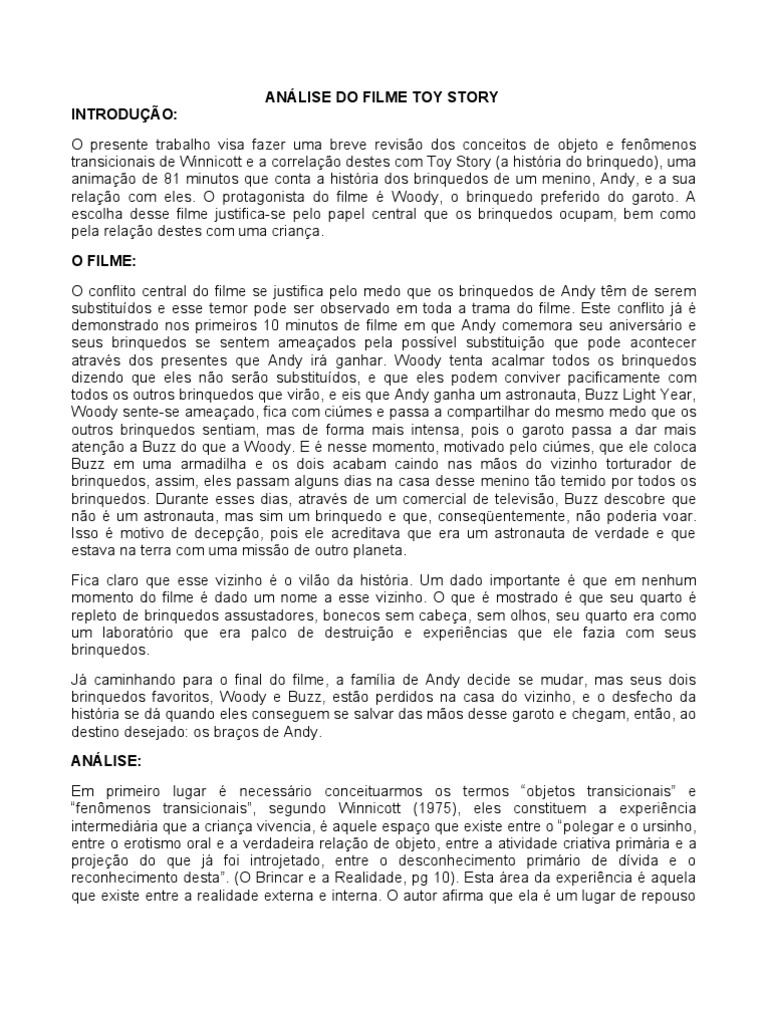 transicionais de Winnicott e a correlação destes com Toy Story (a história do brinquedo), uma