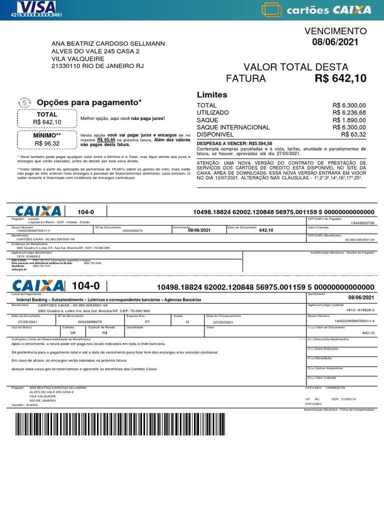 Beneficiário CARTÕES CAIXA - 00.360.305/0001-04 Agência/Código Cedente