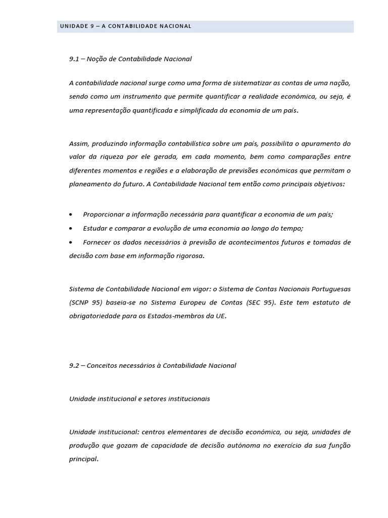 UNIDADE 9 – A CONTABILIDADE NACIONAL