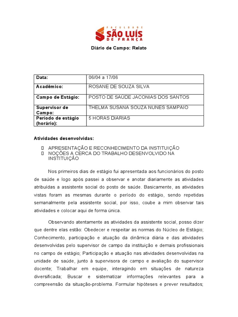 Campo de Estágio: POSTO DE SAÚDE JACONIAS DOS SANTOS